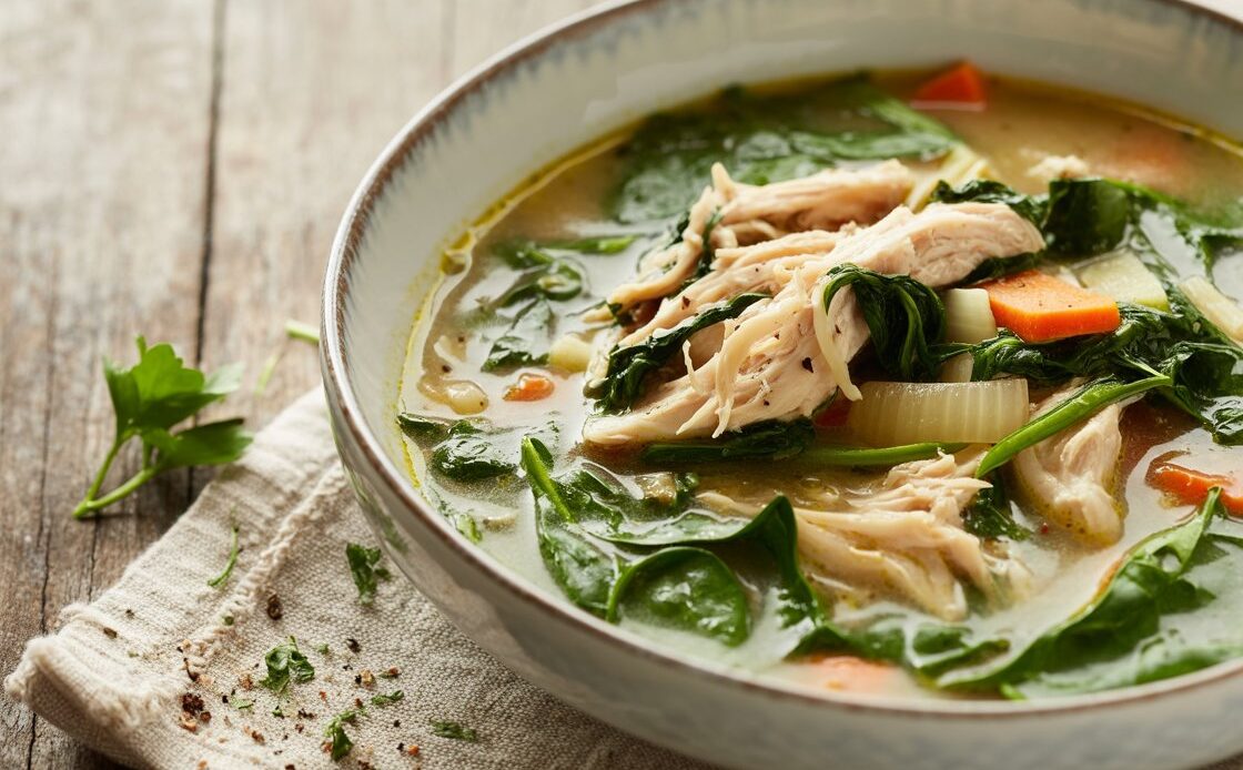 Warm bowl of chicken florentine soup with tender chicken and creamy broth