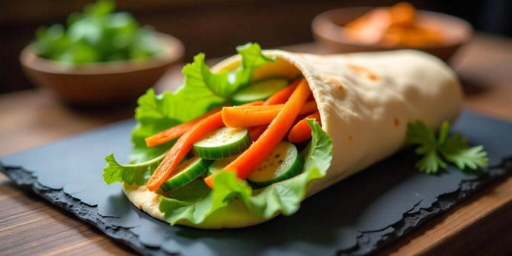 - Vegetable wrap with hummus: Use tortillas to wrap up hummus, spinach, cucumber, and bell peppers for a fresh and filling meal.