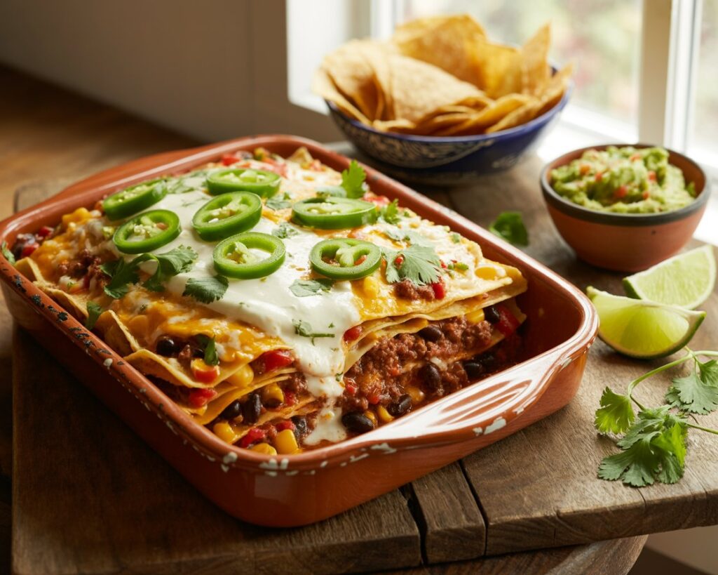 Because Mexican lasagna is rich and flavorful, pairing it with fresh and vibrant sides helps balance the meal. Fresh guacamole with a hint of lime and cilantro offers creaminess and brightness that contrast beautifully with the spicy casserole. Mexican street corn salad—made with grilled corn, cotija cheese, chili powder, and a squeeze of lime—is a crowd-pleaser that adds a smoky, tangy crunch. For a lighter option, a crisp green salad with avocado, cherry tomatoes, and a zesty vinaigrette can refresh the palate and add color to your plate.