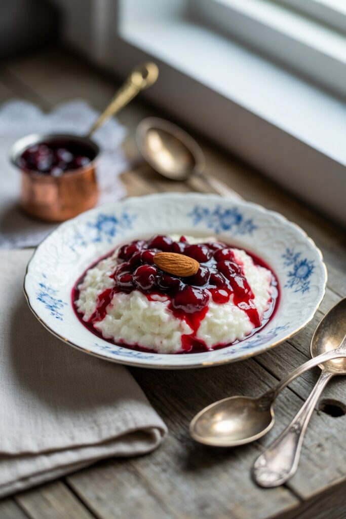 Picture this: the family gathered around the table, each with a bowl of smooth, creamy Risalamande topped with vibrant cherry sauce. One by one, spoons dip into the dessert, eyes darting to see who might find the almond first. When someone thinks they’ve found it, they might grin mischievously or try to look innocent, pretending they haven’t noticed — all part of the game.
