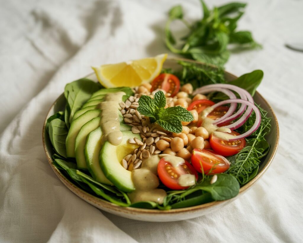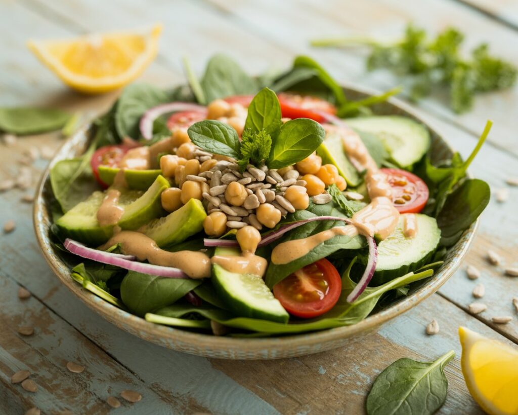 After adding the citrus tahini dressing to the salad, gently toss to combine. Finish with a garnish of fresh herbs such as mint, parsley, or basil. Serve immediately for a fresh, cool, and flavorful meal.