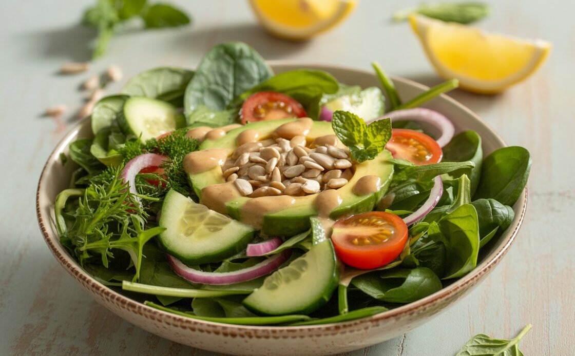 In a small mixing bowl, whisk together tahini, lemon juice, orange juice, and maple syrup. Add water to adjust the dressing’s consistency, making it creamy but pourable. Incorporate salt according to your preference and whisk until a smooth consistency is achieved.
